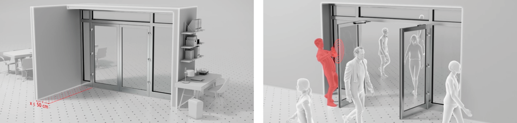- LZR®-FLATSCAN 3D SW 通过立体检测覆盖整个门扇的开启区域,消除全部的风险。它为用户提供了更加舒适的通行体验,并且避免了门扇突然移动靠近行人的不良体验。在任何情况下,它都完全符合EN16005的安装要求。