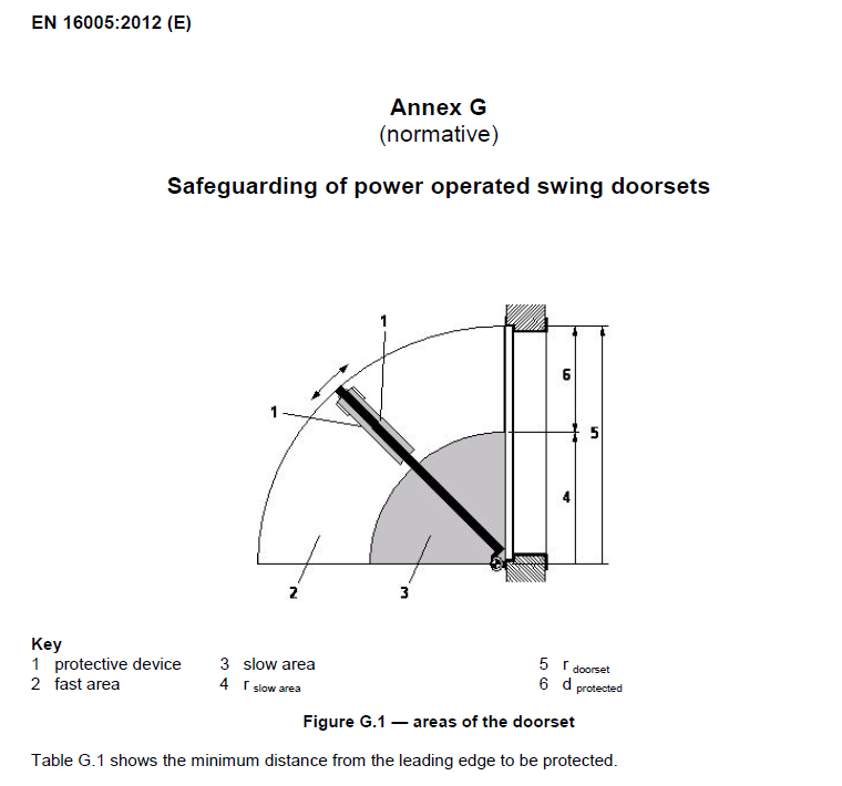 对于正常动能自动平开门,仅需保证部分区域安全,包括门扇前沿边界,铰链区域和部分门扇区域,参考EN16005附录G。